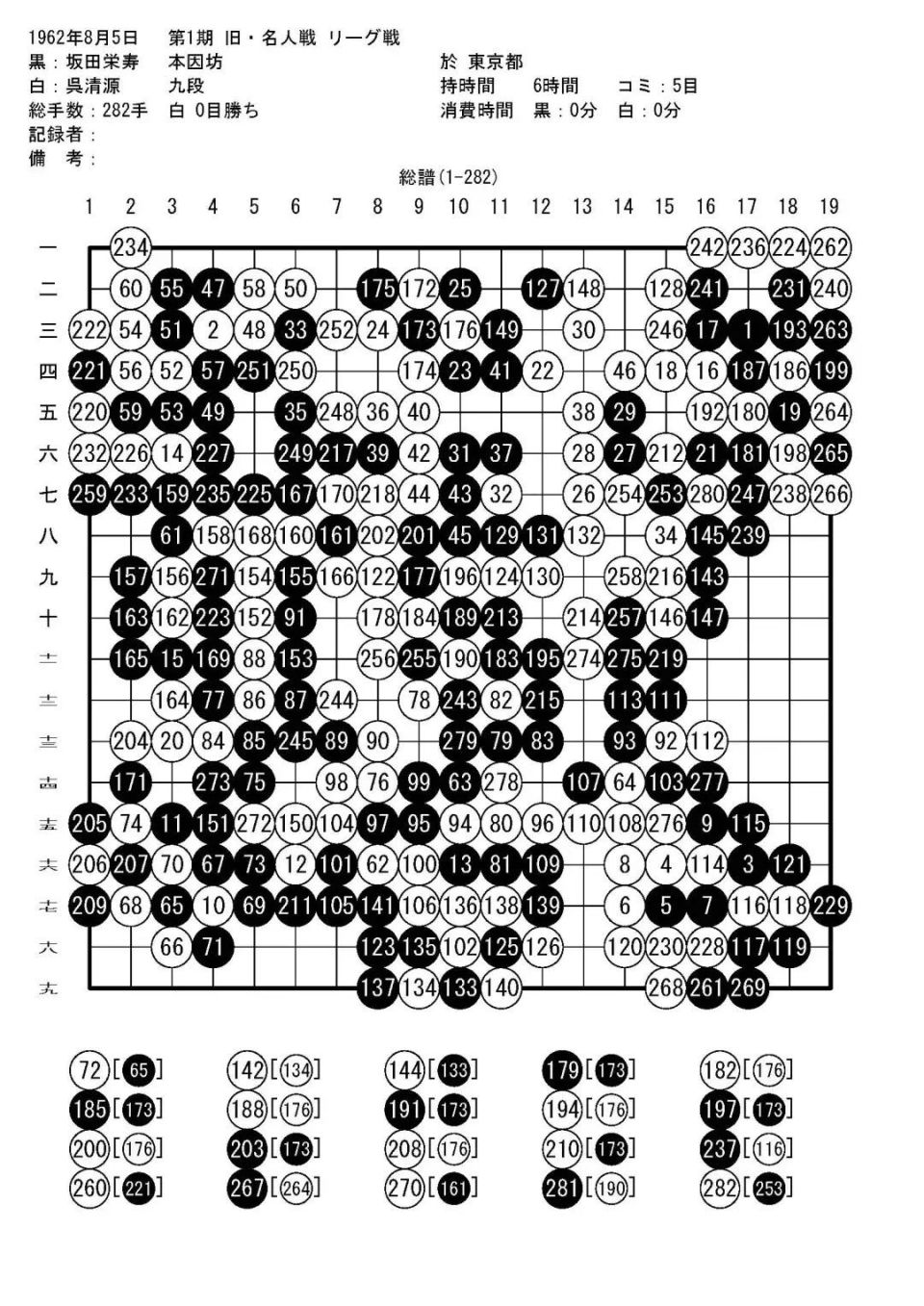 第1期名人战的归属由循环圈的结果决定。为促成名人战立下功劳的藤泽秀行自中盘起一路领跑,追击者吴清源与坂田荣男一道进入最终战。若以9胜2负领跑的藤泽取胜,便无可置疑地加冕名人;若藤泽秀行负于桥本昌二,则8胜3负的吴清vs坂田荣男之战的胜者将与藤泽秀行进行加赛。藤泽秀行很快告负,自觉难免加赛,便在夜里的新宿外出小酌。其时,吴清源与坂田荣男之局则呈现坂田荣男大优。然而结局出人意料。