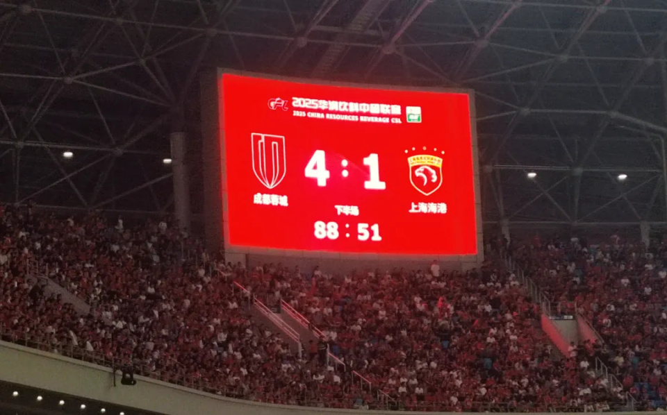 最终,在全场41393名球迷的加油声中,成都蓉城主场4:1战胜上海海港,该比分也创造了成都蓉城胜上海海港的最大分差记录。赢得本场比赛后,成都领先少赛一场的上海申花1分,暂列中超积分榜榜首。8月31日,上海申花和北京国安分别客场对阵武汉三镇和山东泰山。